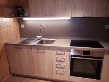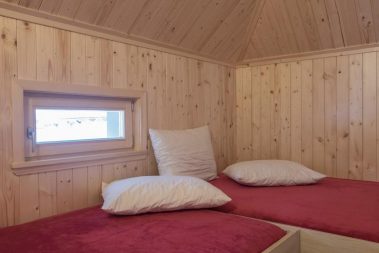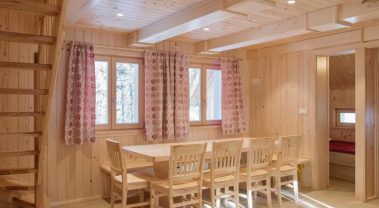 Koča je v notranjosti modernega videza v lesu. V pritličju je predprostor, kopalnica, kuhinja, jedilnica in dve sobi. Skupno je na voljo 10 ležišč. Spodaj v dveh sobah po 3 ležišča in zgoraj v eni sobi 4 ležišča. V kuhinji je pomivalni stroj in talno gretje. Kopalnica ima prav tako talno gretje in tuš kabino in stranišče. Tuš deluje na žetone, ki jih imate pred kopalnico.