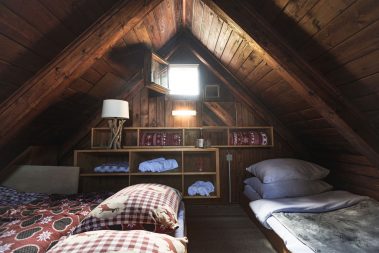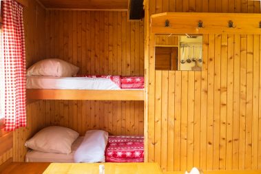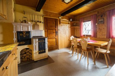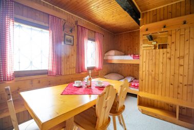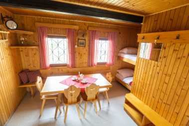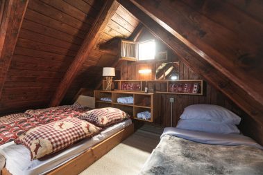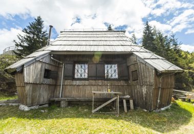 Lepenatka is a small cottage on Velika planina, with nostalgia – with a bunk bed on the ground floor in the common area, upstairs are low beds for five people. The living room is pleasantly furnished in wood. Large table, small kitchen with utensils and two wood stoves. There is a toilet in the chalet, but unfortunately there is no shower yet. Around the chalet is a fenced area for enjoyment or picnic (two tables).