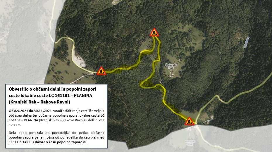 Notice of occasional partial and complete closure of the local road LC 161161 – PLANINA (Kranjski Rak – Rakove Ravni) We would like to inform you that in the period from September 8, 2021 to November 30, 2021, due to the asphalting of the road, there will be occasional partial and complete closure of the local road LC 161161 – PLANINA (Kranjski Rak – Rakove Ravni) in the length of approx.