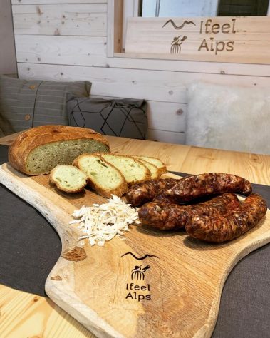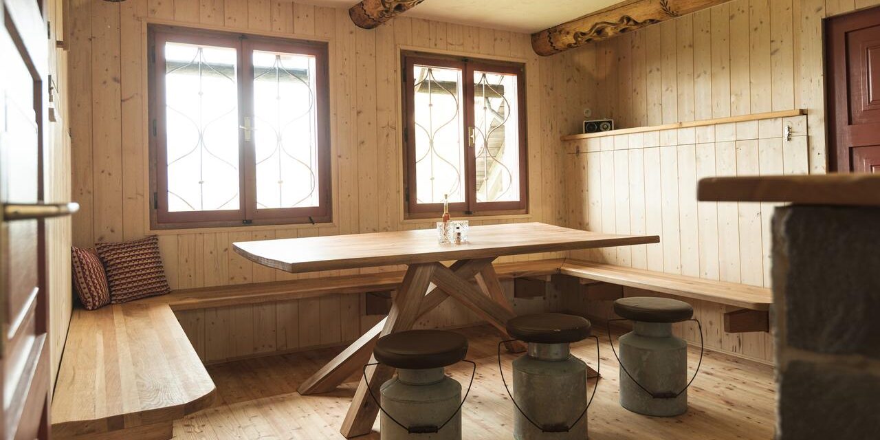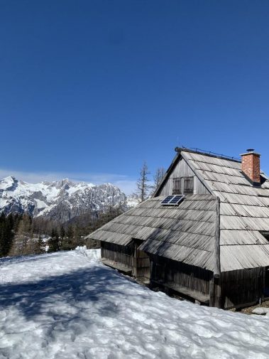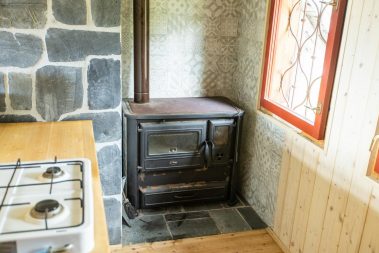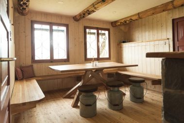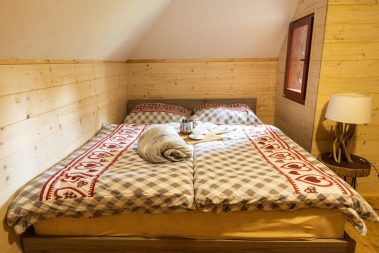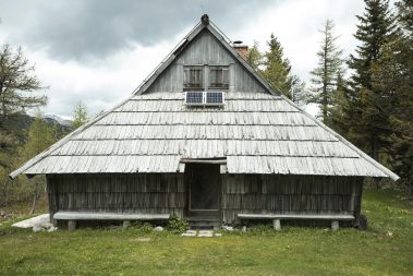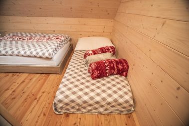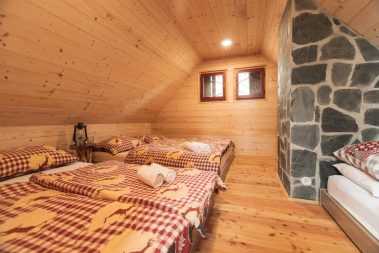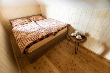 The Rušovc cottage is an old cottage on Velika planina, but newly renovated for the needs of a modern holiday. The cottage has two bedrooms with a double bed and two extra beds in the common area. Upstairs are low beds for five people – two double beds and one for one person. The living area is spacious and nicely furnished. Large table, small but fully equipped kitchen and two wood stoves. There is a toilet in the cottage, NO shower.