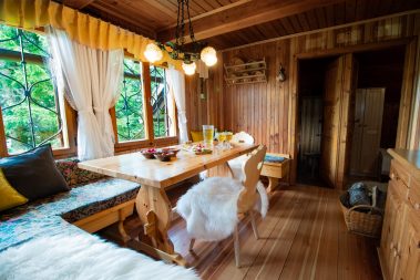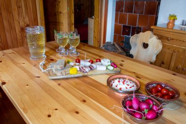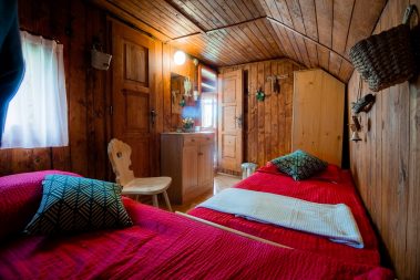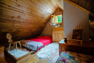 Pinja Cottage is just a 10-minute walk from the cable car, on a small plateau, nestled in a grove of spruce trees, nicely removed from the hiking trails. This makes it ideal for peace and quiet and a perfect point of departure for your visit to Velika Planina. This comfy, cozy cottage offers a living room with a large dining table, fireplace, kitchen with a gas stove and oven, a separate toilet and bathroom with a shower, an internal woodshed and two bedrooms, one containing a double bed, the other with twin beds. The upper floor contains a single, large room with four beds: a double and two singles. The cottage is surrounded by spruce trees and unspoiled nature. A large, fenced-in garden contains an idyllic picnic area for summer dining and direct access to snowy activities in winter. Squirrels make regular appearances in our garden and you can be sure they’ll be there to greet you, too. Inside, you’ll find an array of games for children of all ages, including toys, board games and a stash of equipment at your disposal for various activities for all seasons. The cottage is all yours, which means you’ll have complete privacy.